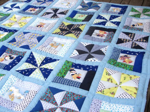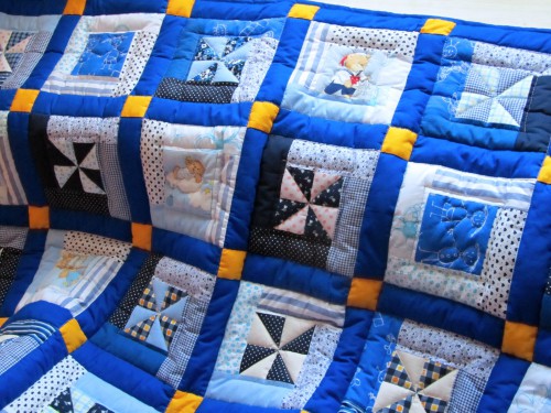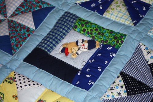 Pro středy některých čtverců jsem použila látku s potiskem medvídků námořníků a medvídků na obláčcích. Pro větší plastičnost jsem medvídky na obrysech prošila. Celá deka je v modrých tónech. Abych ji trochu rozveselila doplnila jsem ji žlutou barvou.