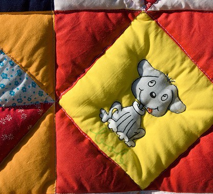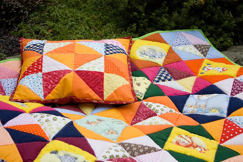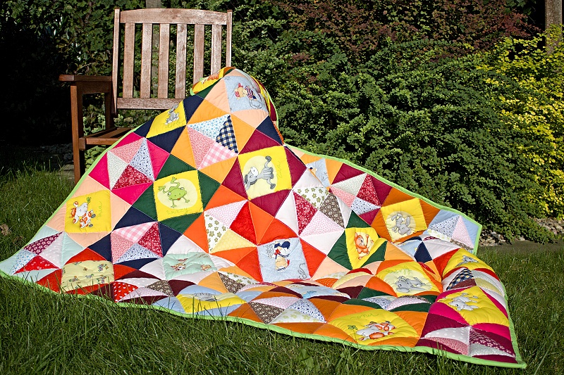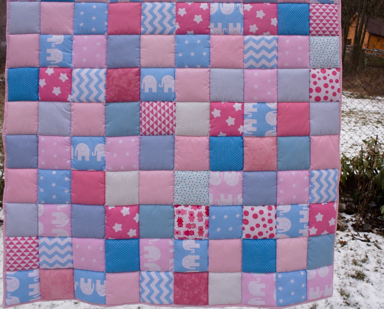 Tuto deku jsem šila pro miminko kamarádky. Je hřejivá, velesá a doufám, že se bude líbit nejen holčičce. Pro větší plastičnost jsem prošila okraje zvířátek a na prošití barevných čtverců jsem zvolila dva druhy švů.