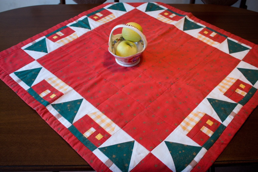 Vánoční ubrus pro pohádkové vánoce doplněný aplikacemi stromečků a hvězdiček